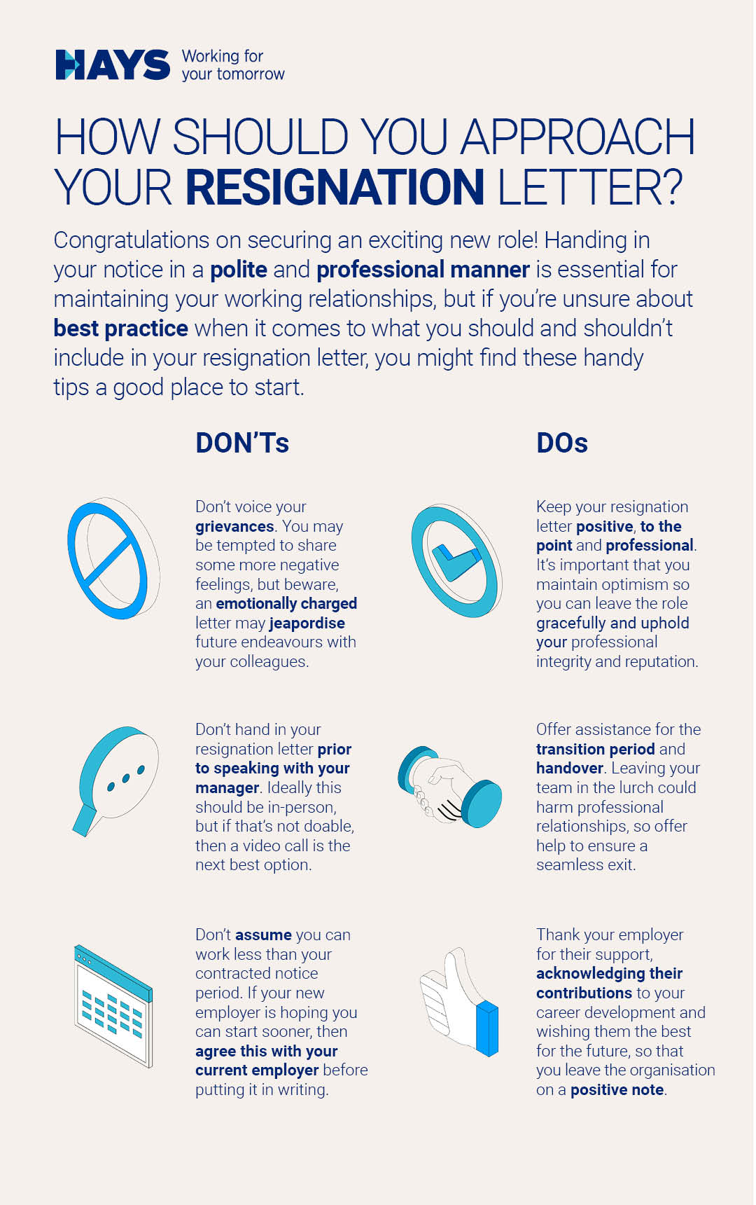 Avoid burning bridges when leaving an organisation by striving to part ways amicably, or at least respectfully. After all, you never know when you might need a glowing reference or a referral for a future job opportunity. What’s more, you may encounter your former colleagues, supervisors or members of the HR team at other organisations in future, so it’s wise to leave on a positive note.